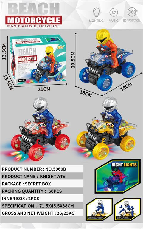 Go on fast-paced adventures with the Knight's Quad! This cool toy offers flashing lights and fun music that makes every playtime magical. With a robust design and exciting features, it is perfect for little adventurers. Encourages imaginative play and motor development.